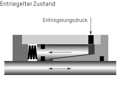 Im verriegelten Zustand, ist zusätzlich zum Entriegelungsdruck eine externe Kraft entgegen der Lastrichtung auf die geklemmte Stange aufzubringen.